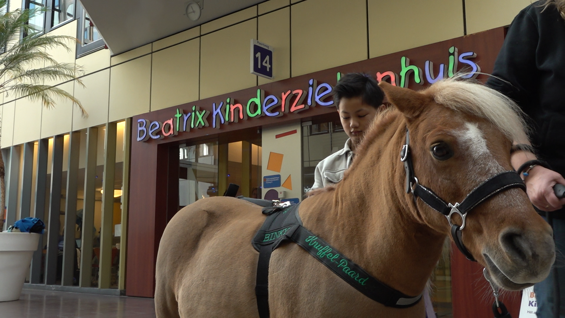 Afgelopen dinsdag bracht Marjan Hartman haar minipaardjes Binky en Cody naar het Beatrix Kinderziekenhuis in Groningen. Een keer per maand bezoekt Marjan het ziekenhuis met haar knuffelpaardjes om de kinderen even af te leiden van hun zorgen en ziekte.