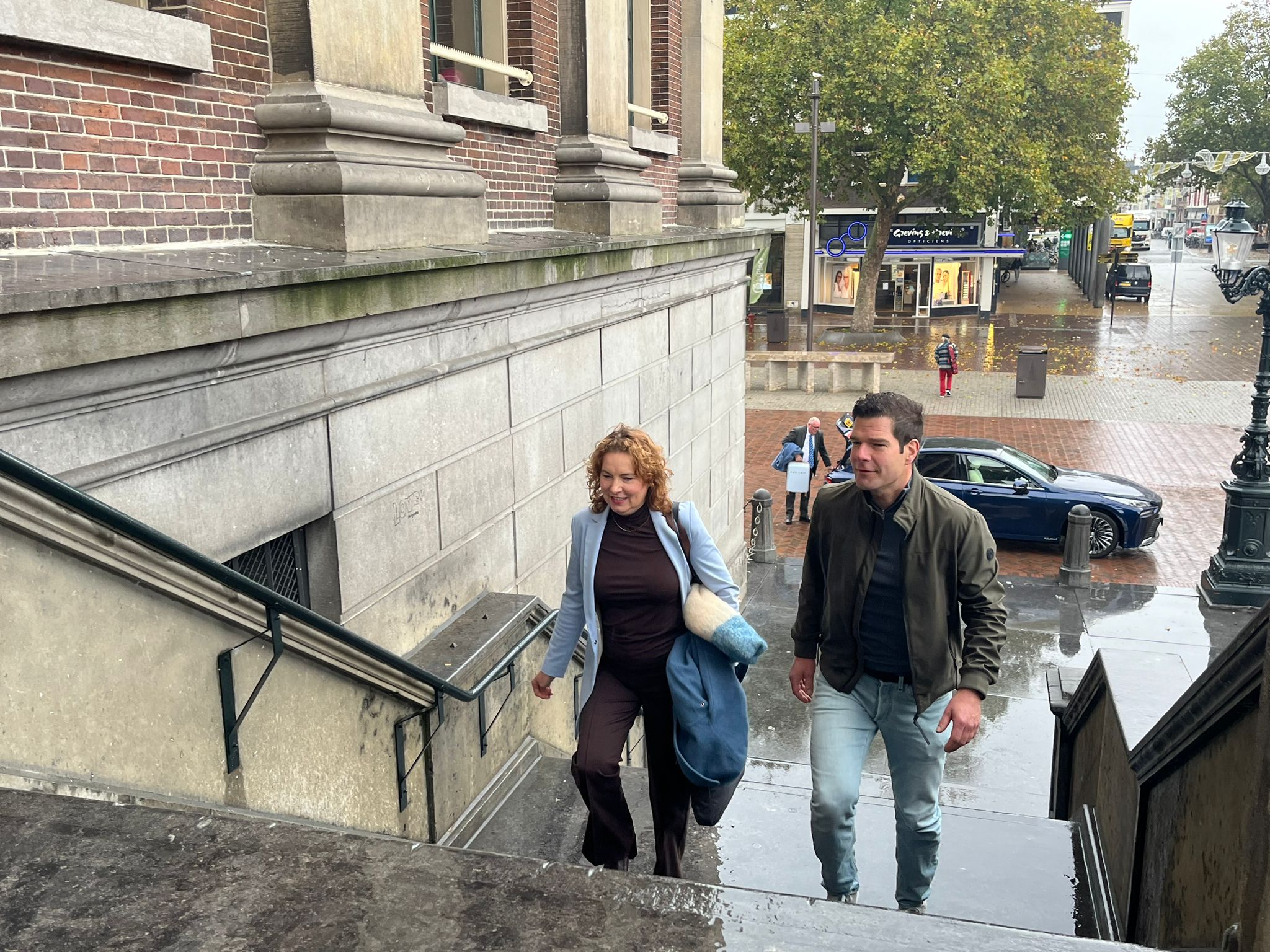 Mirjam van 't Veld betreedt voor het eerst de traptreden van het Stadhuis als waarnemend burgemeester. Foto: Maarten Siepel