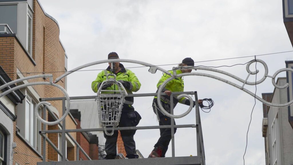 De eerste verlichting is woensdagmiddag opgehangen in de Zwanestraat, de Guldenstraat, de Folkingestraat, de Oude Kijk in ‘T Jatstraat en de Stoeldraaierstraat.
