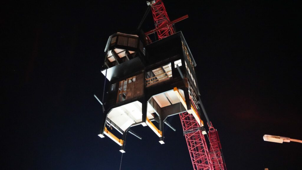 Tweeënhalve week geleden plaatste een aannemer het monumentale seinhuis en de loopbrug (passerelle) terug op hun oorspronkelijke plek op het Hoofdstation. Wie de grote hijsklus nog een keer helemaal wil beleven, kan de twee dagen durende operatie nu terugkijken in ruim een minuut.