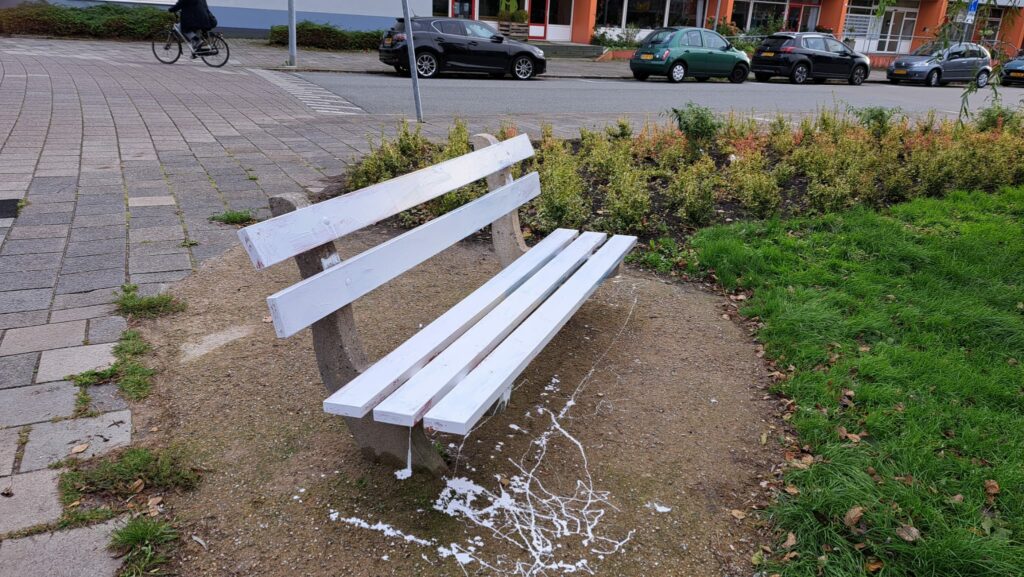 Aan het einde van de ochtend namen twee personen het bankje bij de Herman Colleniusbrug onder handen. Verschillende voorbijgangers zagen het gebeuren en maakten foto’s en spraken de daders aan. De twee gingen echter onverstoorbaar door en gooiden na het vandalisme de verfpot en kwast in het Reitdiep. Ruim een half uur later werd het duo gespot aan de Zonnelaan in de wijk Paddepoel waar een tweede regenboogbankje met witte verf onder handen werd genomen.
