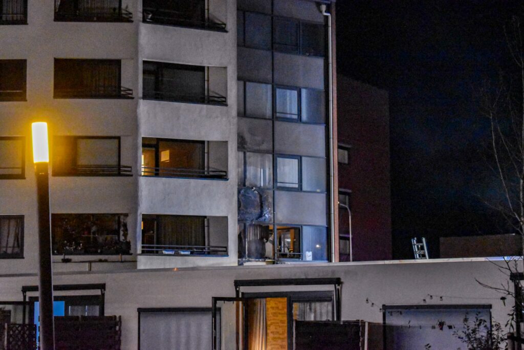Verschillende ramen van het appartementencomplex aan de Oosterhamriklaan zijn gesprongen en het gebouw ligt er deels zwartgeblakerd bij. Ondanks de grote schade kijkt de brandweer tevreden terug op de inzet.