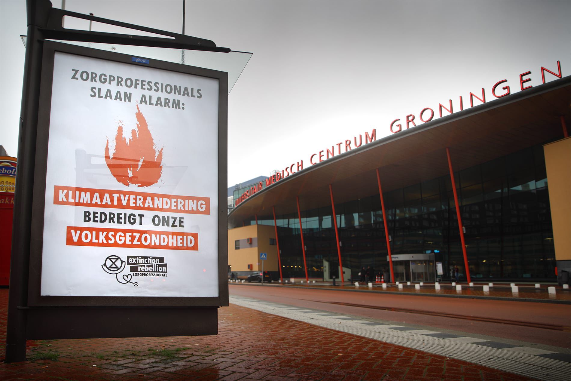 Zorgprofessionals van Extinction Rebellion hebben vrijdagavond in meerdere steden in het land, waaronder in Groningen, posters opgehangen. Met de posters wordt gewaarschuwd voor de klimaatverandering die de volksgezondheid bedreigt.