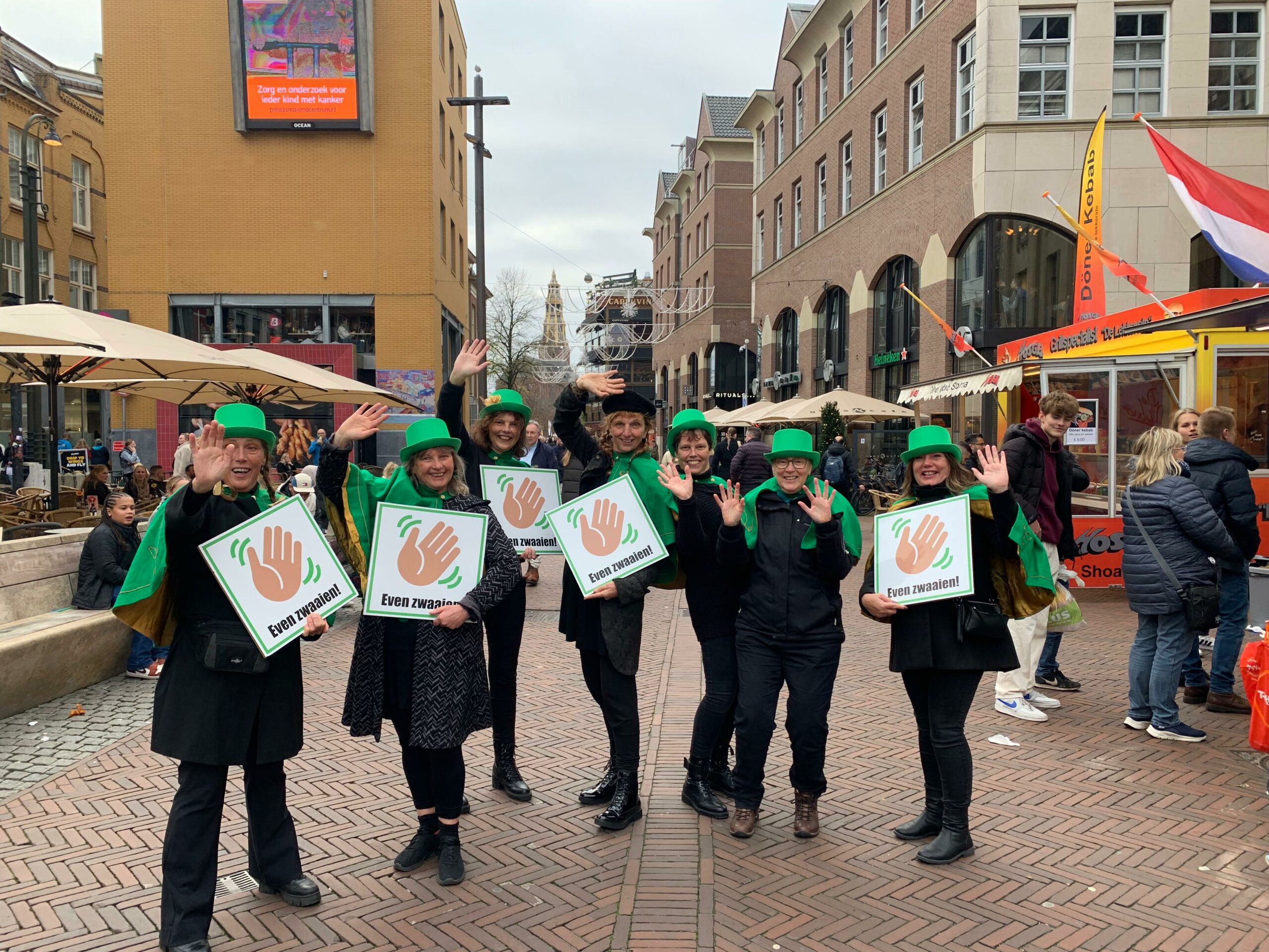 De vriendelijke zwaaiers begonnen bij de roltrappen in het Forum aan hun route. Vervolgens ‘zwaaide’ het gezelschap zich richting de Herestraat, om de ‘Groetroute’ af te sluiten met gewuif naar treinreizigers op het Hoofdstation.