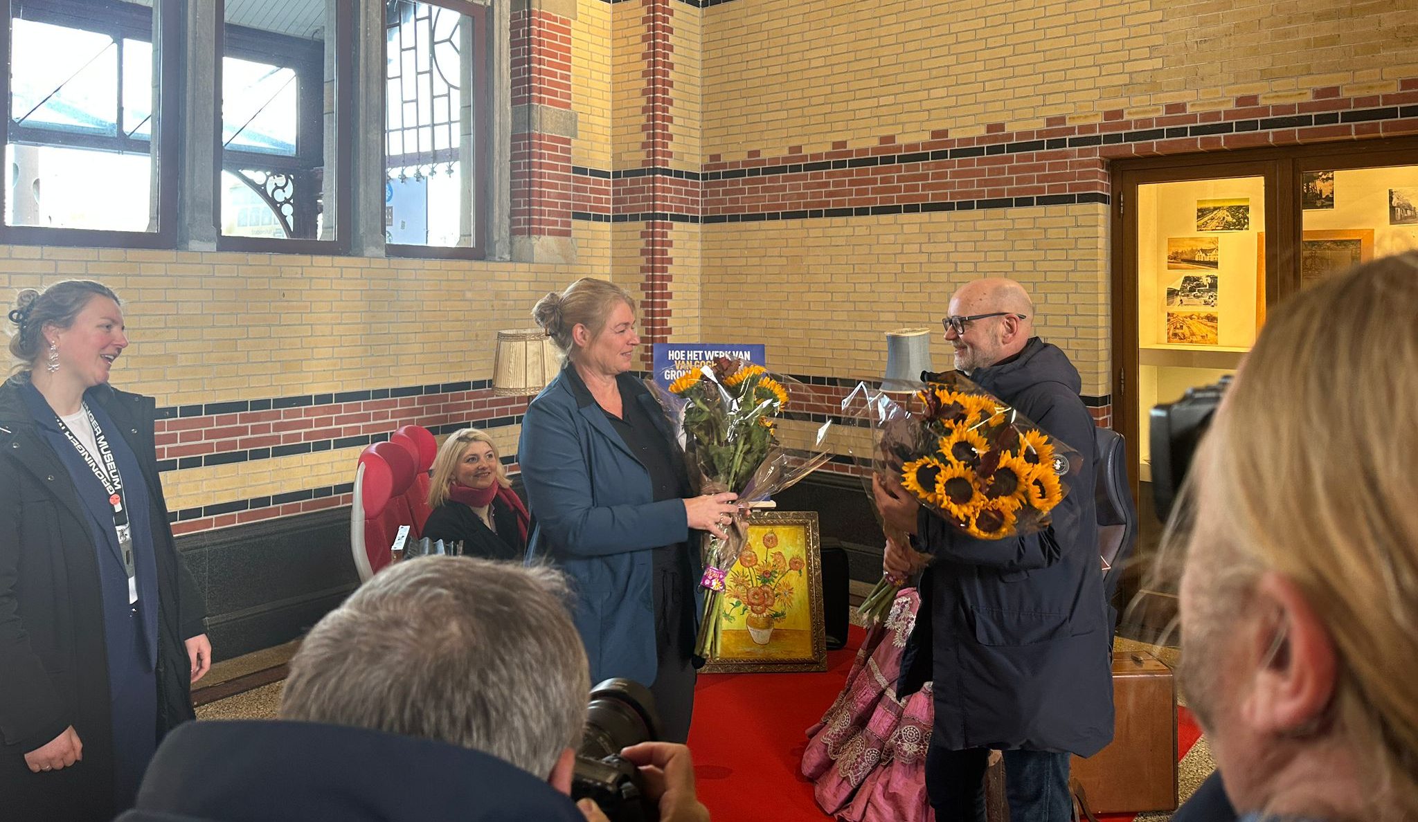 In de stationshal van het Hoofdstation presenteerden het Groninger Museum en de NS donderdagmiddag een Van Gogh luistercoupé. Reizigers kunnen een stukje verhaal beluisteren hoe van ‘Hoe Van Gogh naar Groningen kwam’.