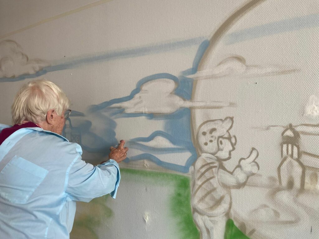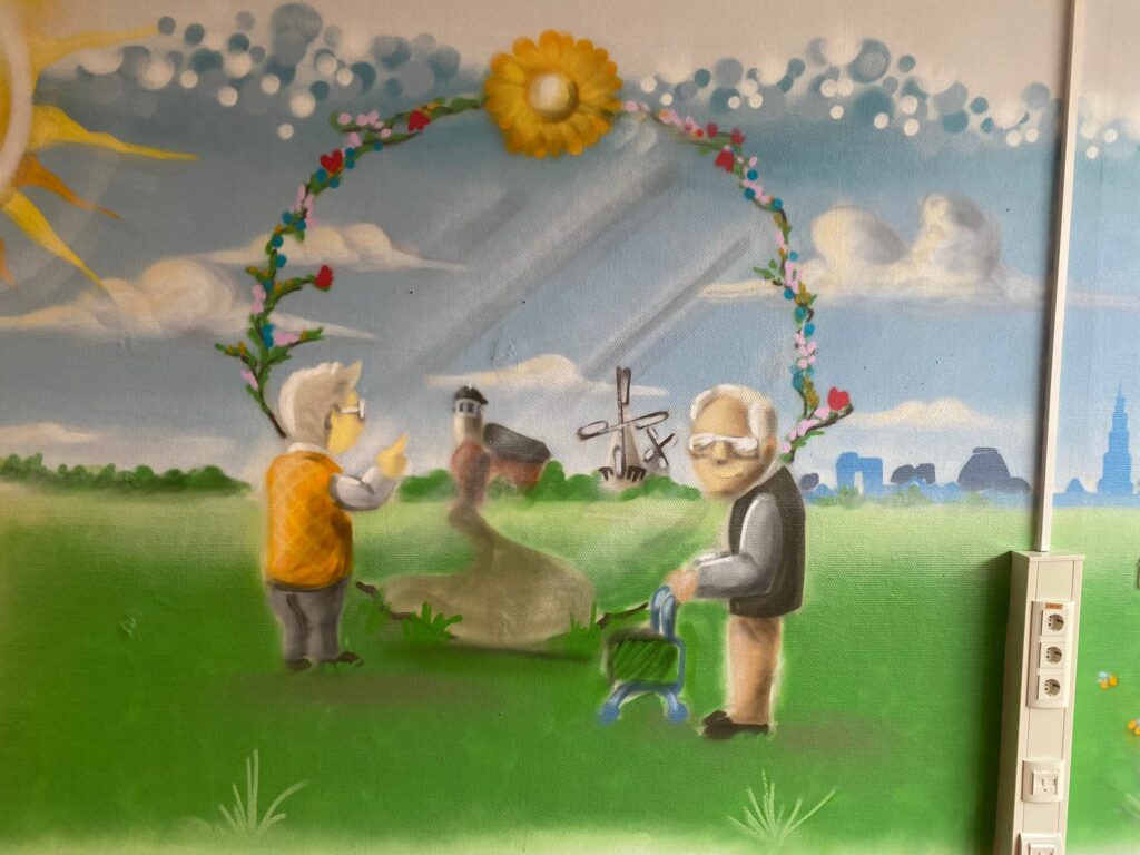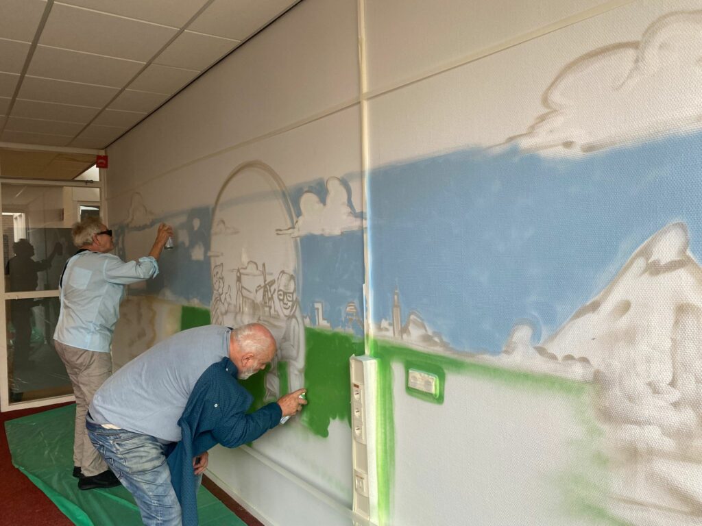 “Na het ontwerpen heb ik de schets aangebracht op de muur. En toen was het inderdaad de beurt aan de ouderen om aan de slag te gaan. Daar had ik goed over nagedacht. Je gaat met spuitbussen verven in een ruimte. Dus ik had de groep opgesplitst zodat niemand zich te lang in de ruimte zou bevinden. Van tevoren had ik overigens niet bedacht of het goed of minder goed zou gaan in vergelijking met als ik dit door jongeren laat doen. Maar het ging verrassend goed. Wat ik merkte is dat de spanningsboog veel minder strak staat. Ouderen kunnen het geheel overzien, ze weten wat het doel is. Bij tieners is dat veel lastiger. Daarnaast merkte je ook hier weer de levenservaring. Ouderen die regelmatig schilderen of bezig zijn met kleurplaten. Ze wisten waar ze mee bezig waren, er was ervaring en ik hoefde niet zoveel uit te leggen. Het sprak voor zich. Het was heel gezellig.”