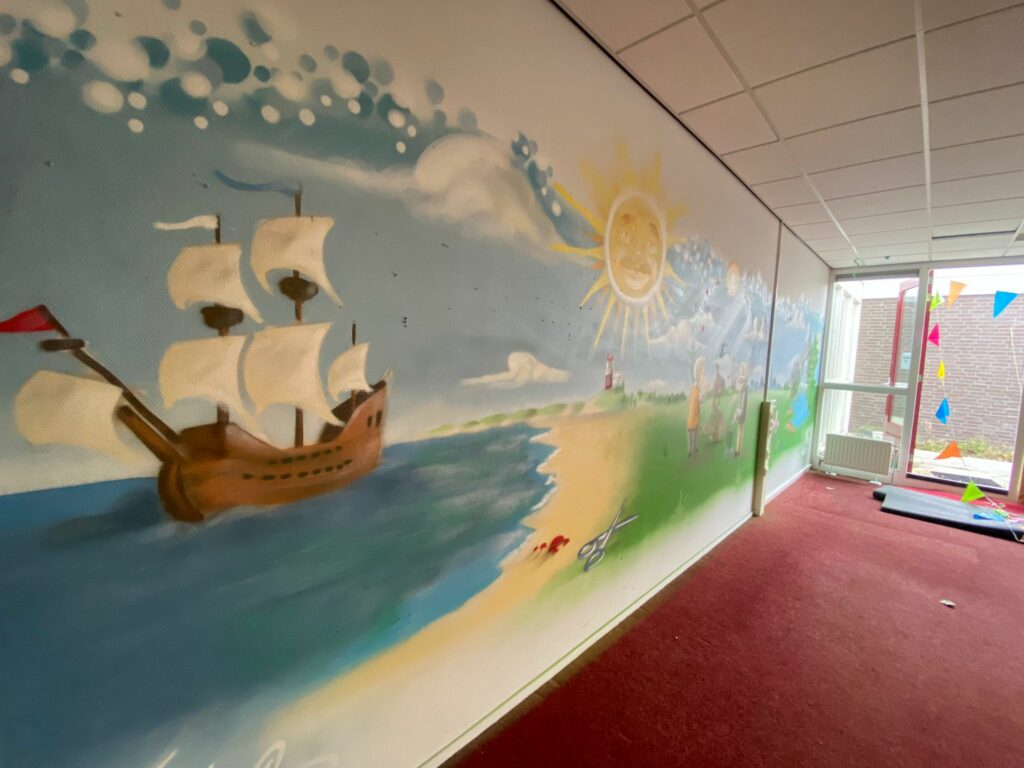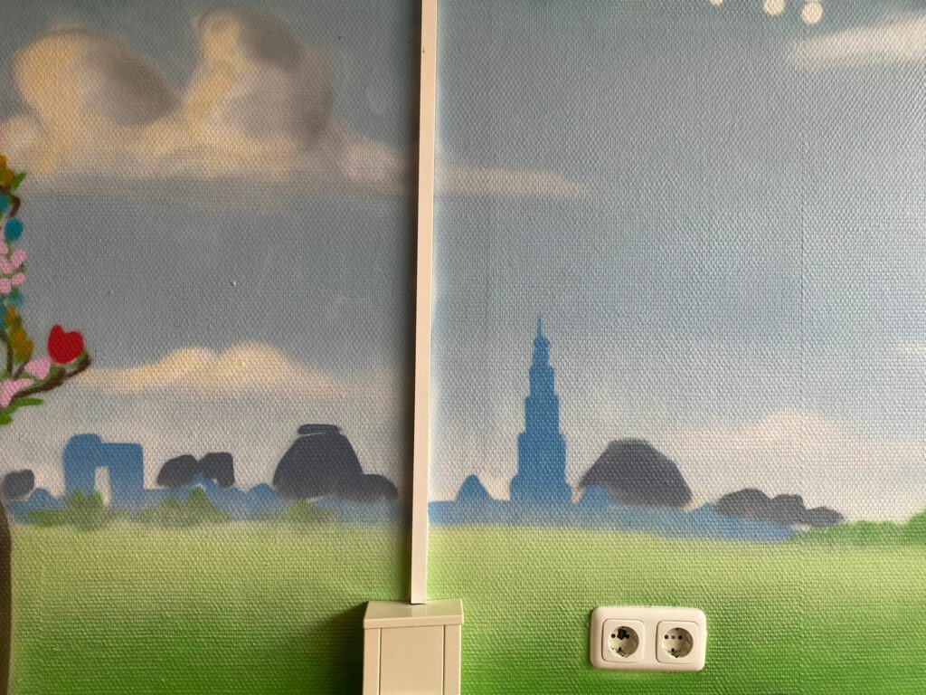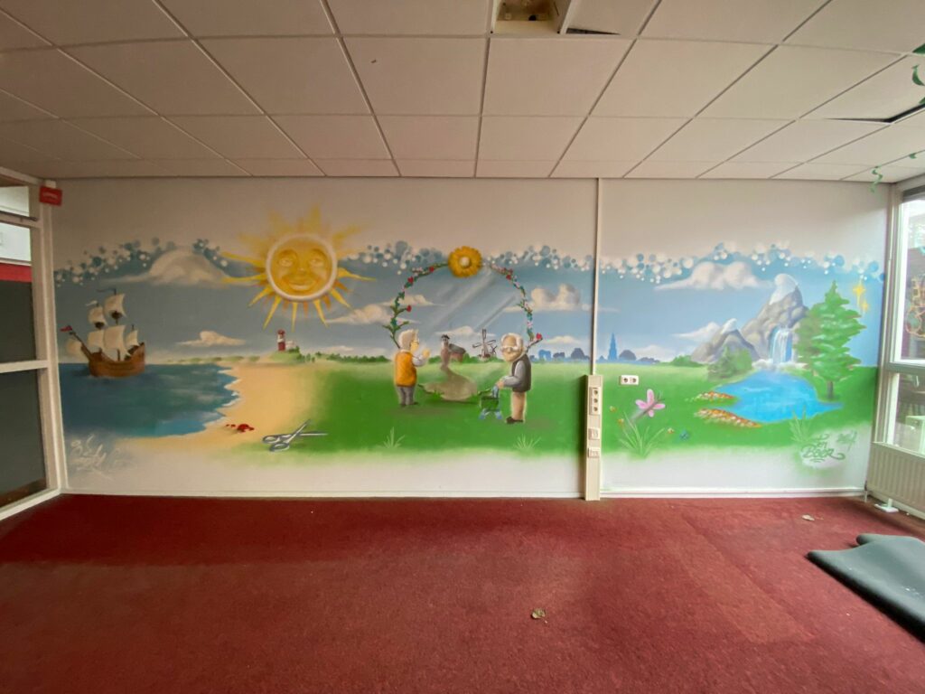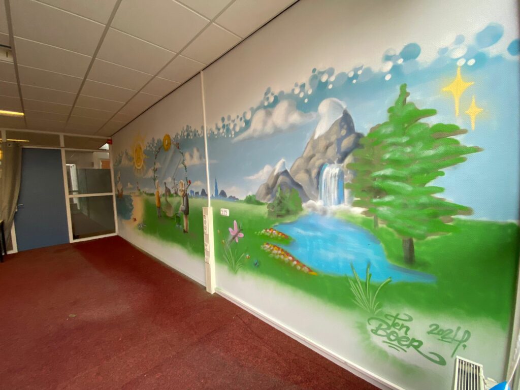 “Klopt. Deze school sloot in 2020 de deuren. Daarna hebben kinderen van basisschool De Til uit Thesinge er nog een tijd les gekregen. Sinds een jaar is het gebouw in gebruik om bewonersinitiatieven gestalte te geven. De afgelopen periode heb ik met jongeren uit het dorp al de muren van zo’n vier klaslokalen verfraaid. In het lokaal waar ze voorheen zaten bevond zich ook zo’n kunstwerk. De ouderen gaven aan zoiets ook wel te willen op hun nieuwe plek en ze vroegen zich af of ik niet opgespoord kon worden. Nou, nu is Ten Boer niet zo’n heel groot dorp. Dus ik was snel gevonden.”
