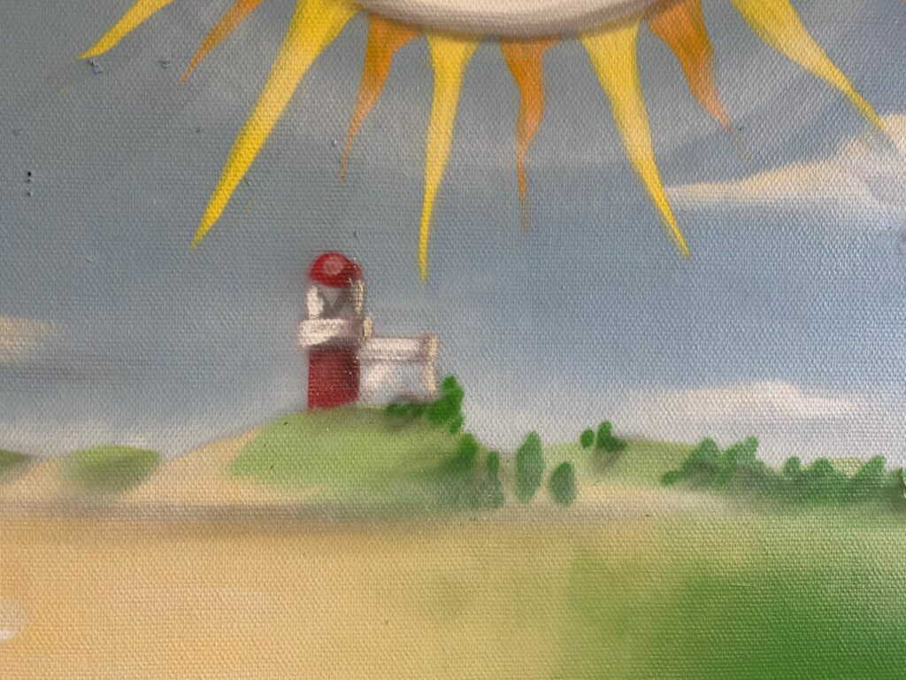 “Het is een heel fraai landschap geworden. Je ziet de skyline van Groningen. Maar inderdaad ook duidelijke kenmerken van Ten Boer. Je ziet de poort terug waar een pad naar toe loopt. De vuurtoren van Vlieland is afgebeeld omdat er een aantal ouderen houden van strand en zee. Persoonlijk vind ik de vuurtoren van Vlieland veel karakter hebben, omdat er een uitkijkpost aan vast zit. Dat hebben andere vuurtorens in het Noorden niet.”
