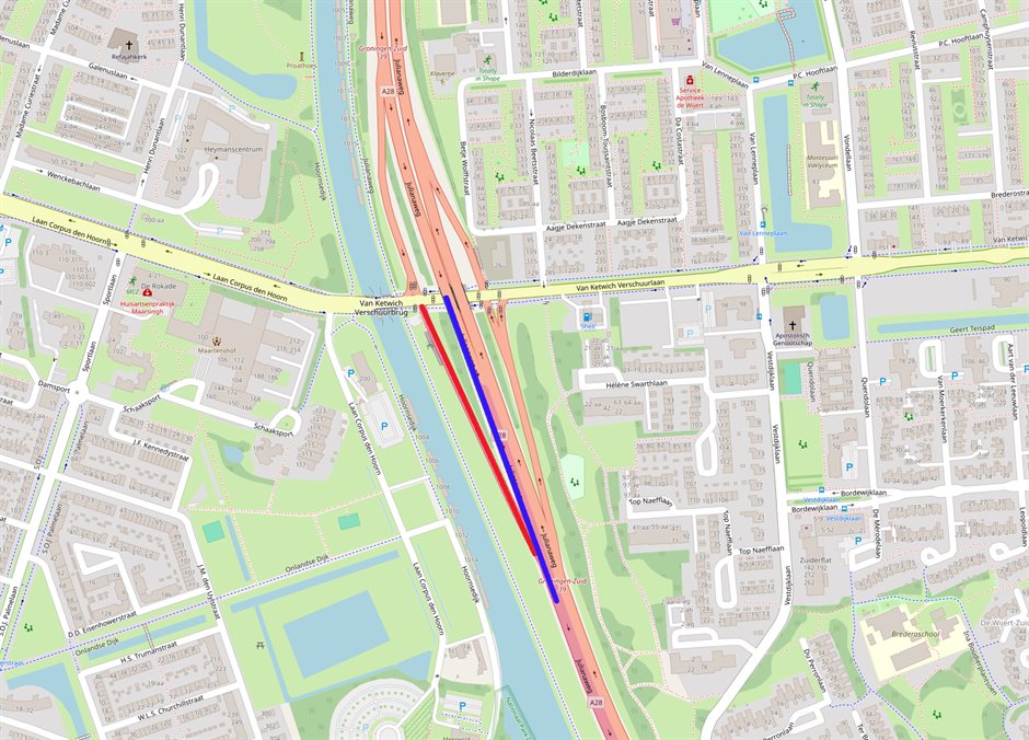De toerit van de Van Ketwich Verschuurlaan naar de A28 richting Haren is komend weekend afgesloten vanwege het plaatsen van groenschermen.