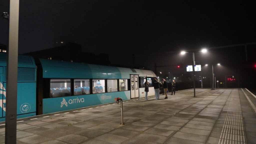 Door de storing moest een trein geruime tijd stil blijven staan op station Europapark. Foto: Patrick Wind - 112groningen.nl