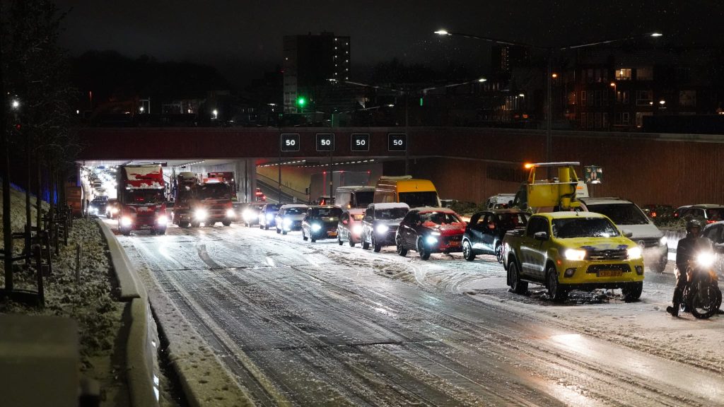 De sneeuwchaos van donderdagavond heeft gezorgd voor bijzondere oplossingen. Op filmpjes, die zaterdag online werden geplaatst, is te zien hoe een vastzittende vrachtwagen in de tunnelbak van de verdiepte ligging zichzelf vooruit drukt door gebruik te maken van een graafmachine.