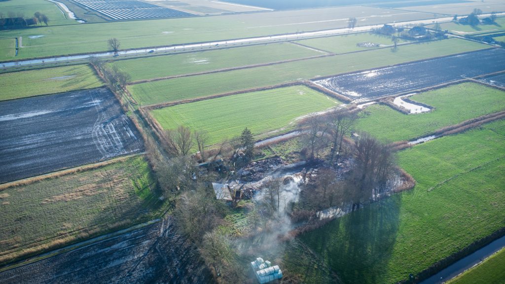 “Toen we arriveerden sloegen de vlammen uit het schuurgedeelte van de boerderij”, vertelt brandweerwoordvoerder Emiel de Vries. “Al snel besloten we om dit gedeelte gecontroleerd uit te laten branden en om in te zetten op het behoud van het woonhuis. Dat is uiteindelijk niet gelukt. Om de brand goed te kunnen blussen hebben we hulp gekregen van een kraan met een sorteergrijper. Daarmee zijn de restanten uit elkaar getrokken, zodat we deze materialen goed konden afblussen.”