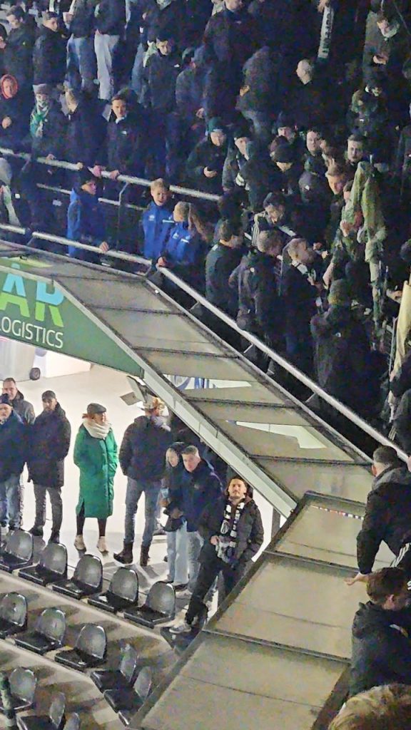 Het uitvak vroeg aandacht voor de val, waarna er onrust ontstond in het uitvak. De wedstrijd is tijdelijk stilgelegd.