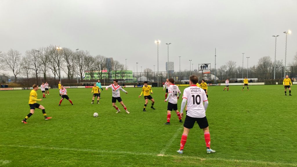 Het verschil tussen de (gemengde) eerste klasse en de zondag tweede klasse is groot. Dat bleek vanmiddag ook bij de rommelige topper in 2H. Veel toevalsvoetbal waar ogenschijnlijk geen idee achter zat. Dat wil zeggen dat beide trainers hun spelers vast de nodige aanwijzingen en opdrachten meegeven, op het veld was er niet veel van terug te zien.