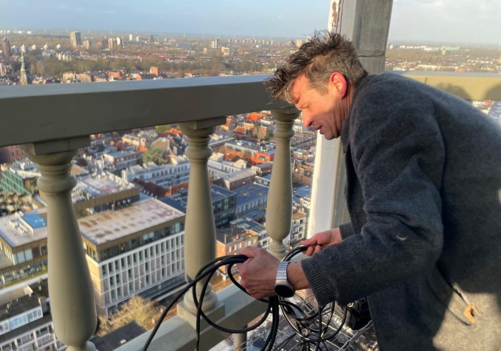 Lampen, bekabeling en allerhande andere apparatuur moesten met de hand omhoog gedragen worden in de 96,8 meter hoge toren. “Met een mannetje of veertig à vijftig hebben we alle spullen de Martinitoren ingesleept, samen met Harry en Chris Garrit,” vertelt Jan Akkerman namens Winterstad. Aan het begin van de middag testten medewerkers van Powersound, het bedrijf dat de verlichting verhuurt en beheert, alle geïnstalleerde apparatuur.