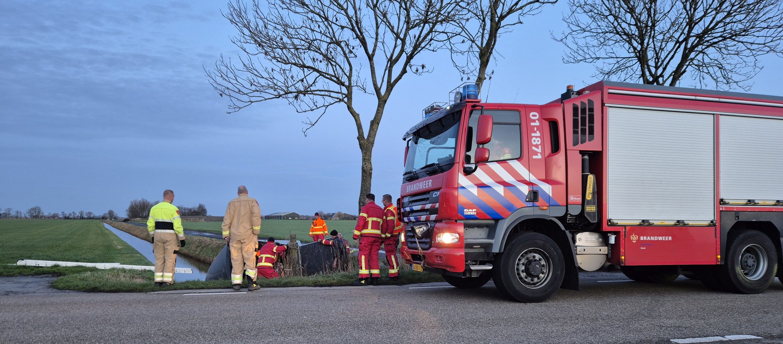 Aan de Boersterweg in Sint Annen is vrijdagmiddag een paardentrailer in de sloot beland.
