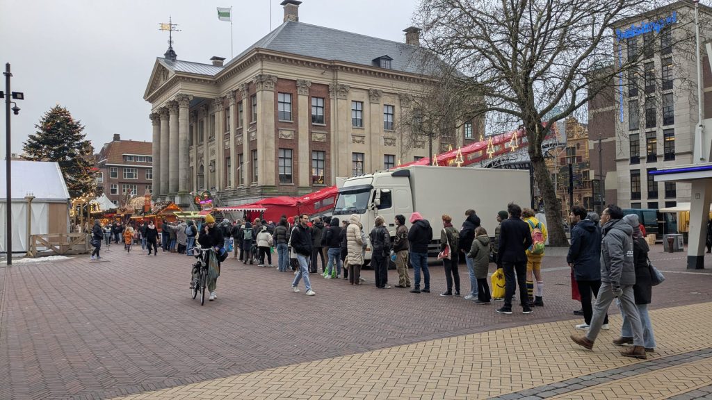 Om elf uur was de wachttijd op de Grote Markt al zeker een kwartier. Tegen het middaguur moest er tussen de 25 en 45 minuten gewacht worden, totdat klanten aan de beurt waren om te bestellen. Tot in de Oude Ebbingestraat stonden mensen te wachten om bollen te bestellen.