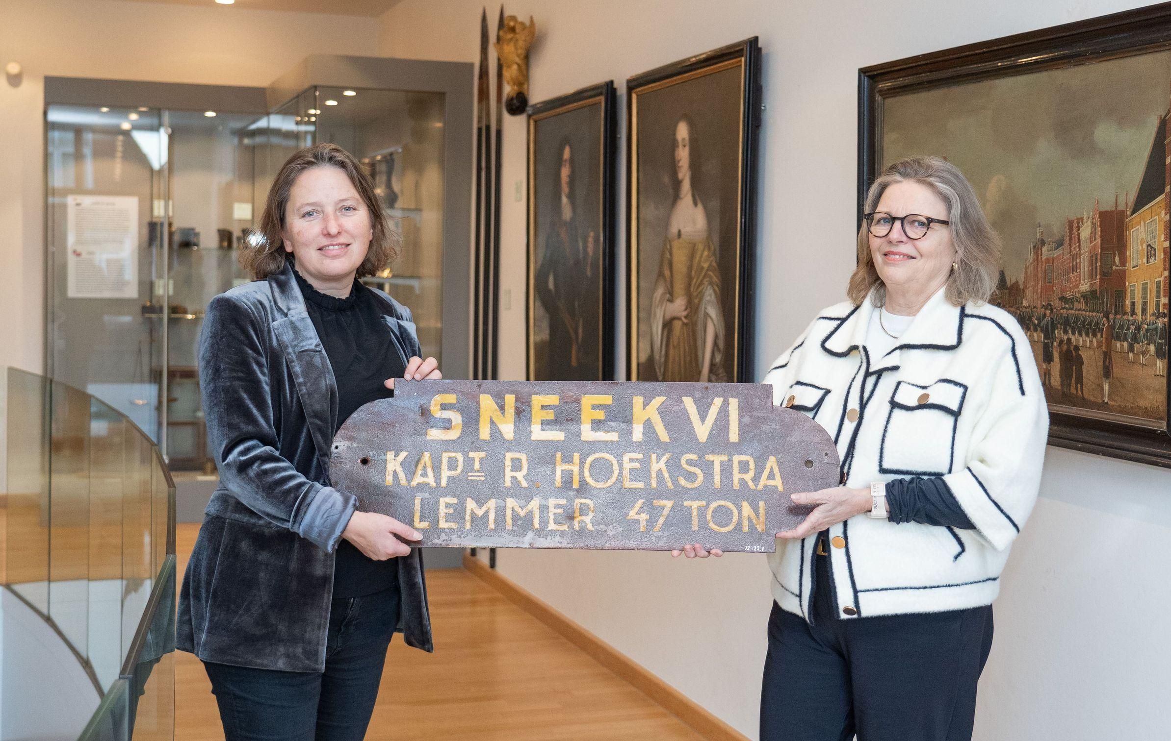 Directeur bestuurder Museum aan de A Nicolette Bartelink (rechts) overhandigt naambord van het beurtschip Sneek VI aan Hester Postma, directeur van het Fries Scheepvaart Museum - Foto: Fries Scheepvaart Museum