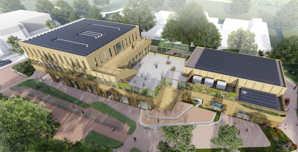Nieuwe gymzaal en schoolplein (deels) op het dak