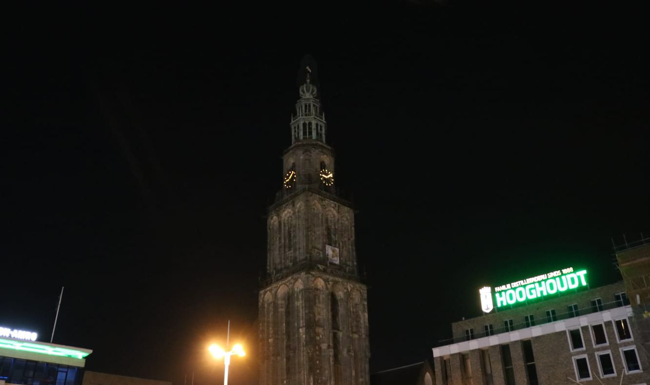 De Martinitoren staat vanaf deze maandag weer in het donker. De tijdelijke verlichting, die de toren tijdens de winterperiode in de schijnwerpers zette, is maandagochtend verwijderd.