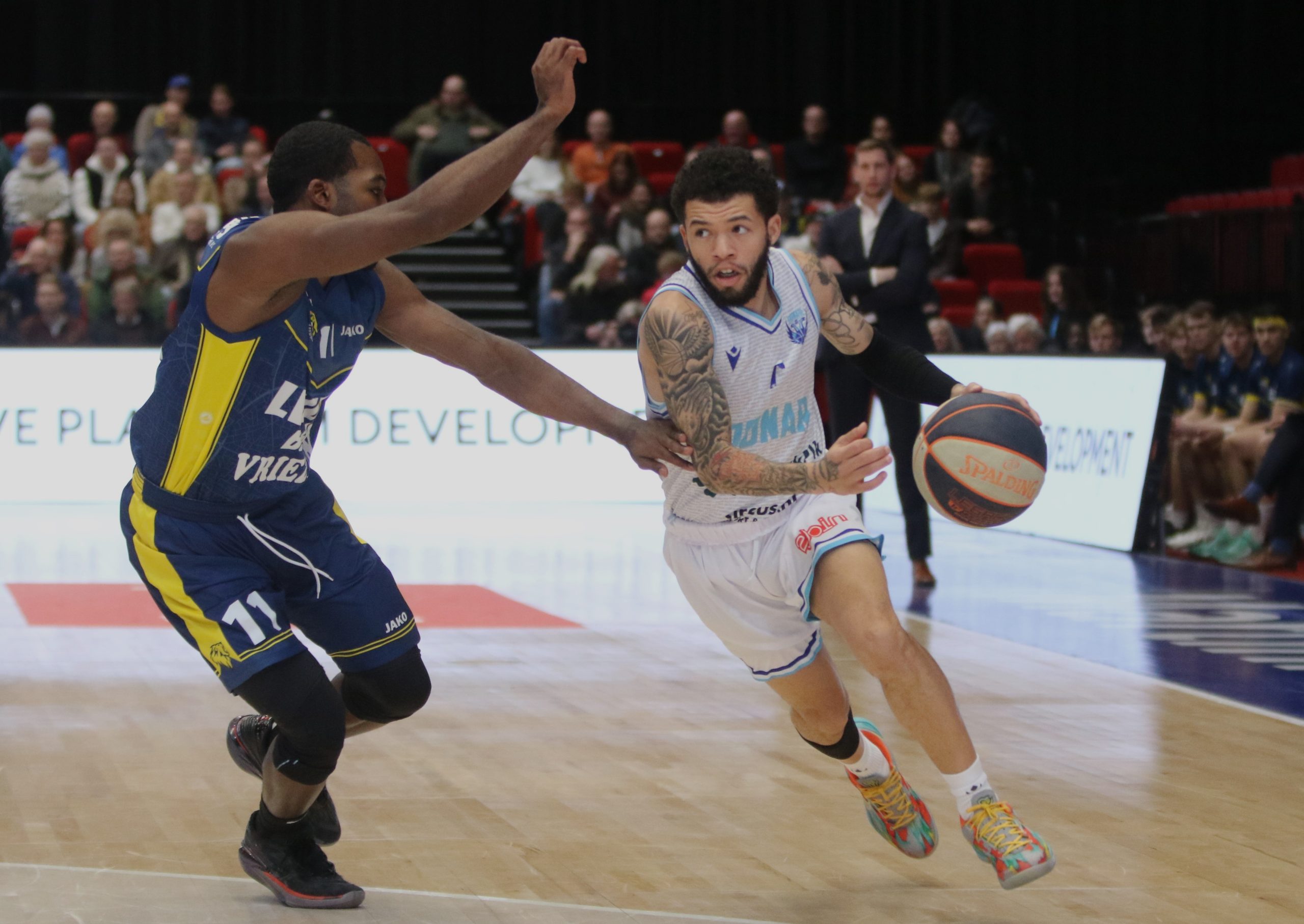 James Karnik was de grote man aan Groningse zijde met 19 punten en liefst 18 rebounds. Tavian Dunn-Martin had ook een ‘double-double’, met 15 punten en 10 assists. Filip Brankovic was goed voor 18 punten en Tim Hoeve voor 14 punten. Bij LWD Basket was Matt Frierson topscorer met 20 punten.