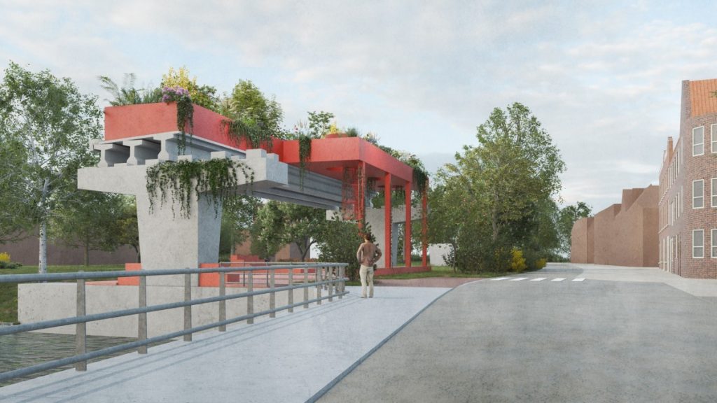 Die begint dus komende donderdag, met meer en nieuw beeldmateriaal van het ontwerp. De delen van de oude weg worden in het voorlopige ontwerp gecombineerd met nieuwe onderdelen, zoals een podium en een stalen constructie en krijgen zo een nieuwe functie. In de loop der jaren worden ze overgenomen door het groen van hangende planten. Kunstpunt liet ook de bovenstaande video maken, waarin Beijaert uitlegt hoe het ontwerp tot stand is gekomen.