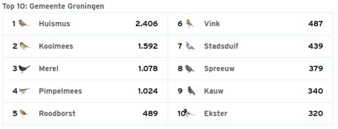 De top vier van meest getelde vogels in de gemeente is gelijk aan die van de vorige twee jaar. De roodborst wist de spreeuw van plek vijf te stoten. De stadsduif klom twee plaatsen in de top tien (plek 7), die werd afgesloten door de ekster.