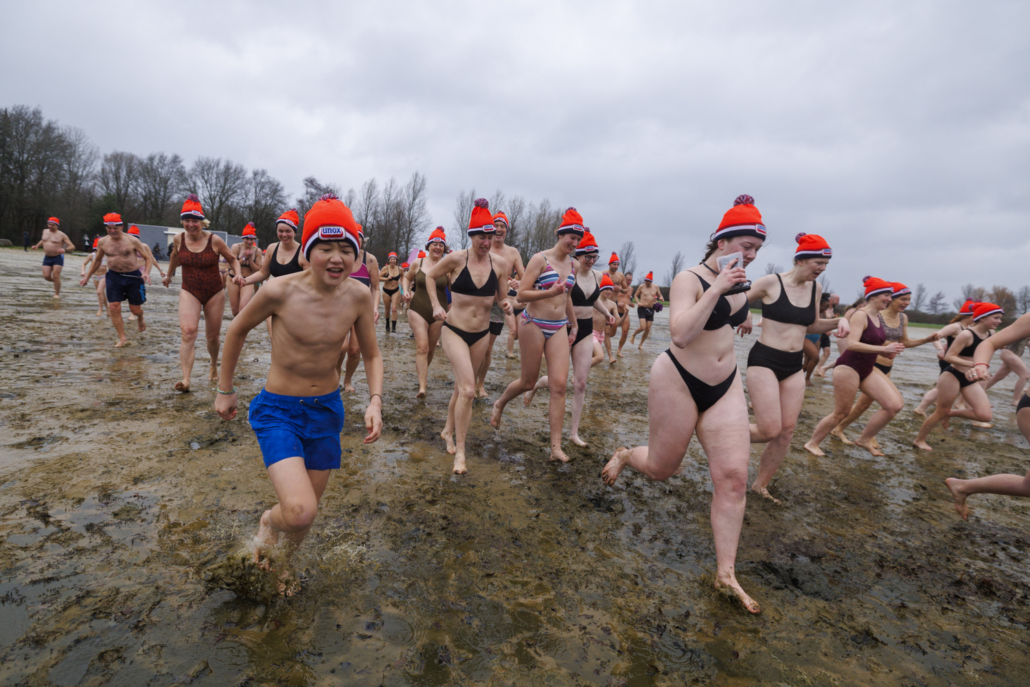Ondanks de harde wind namen tientallen Groningers woensdagmorgen een frisse duik in de Hoornseplas, zoals te zien op de foto’s.