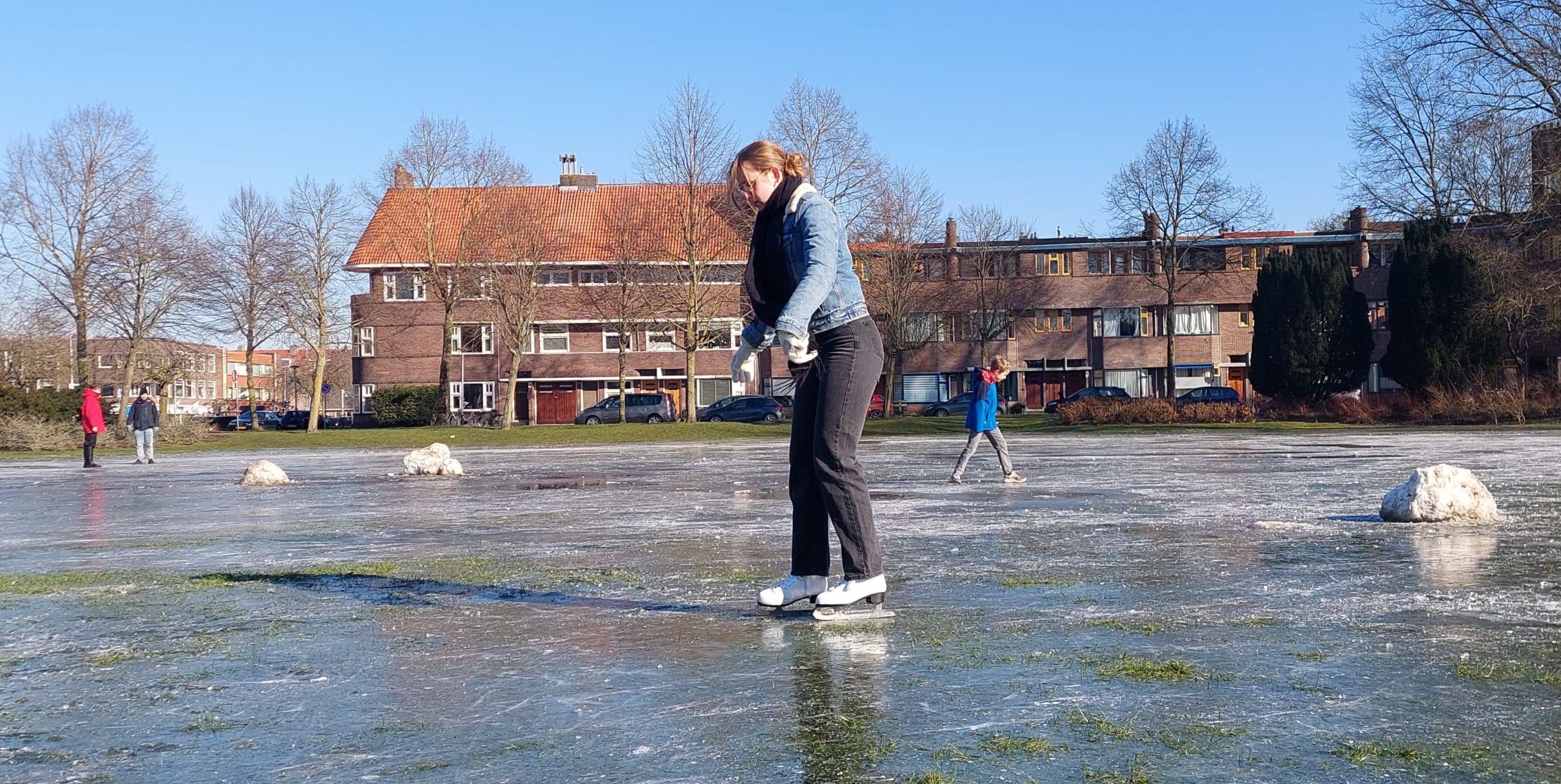Niet alleen in Noordlaren werden dinsdagochtend de ijzers ondergebonden. Ook op het Bernoulliplein in de Korrewegwijk beproefden schaatsers zich op het ondergespoten grasveld.
