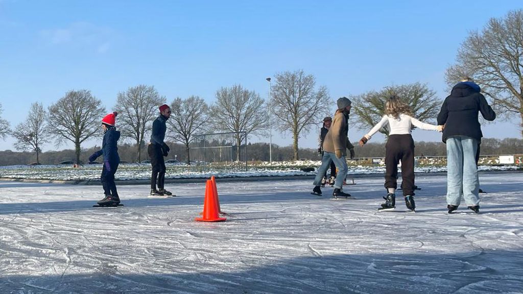 Er wordt maandagochtend volop geschaatst op de ijsbaan in Noordlaren. Na een hele nacht werk door ijsvereniging De Hondsrug bonden tientallen mensen de ijzers onder. De pret was wel van korte duur: rond 11.30 uur ging de ijsbaan weer dicht.