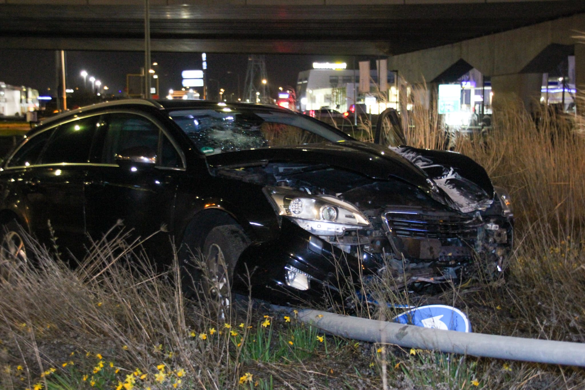 De auto ramde ook een lantaarnpaal, waardoor het voertuig forse schade opliep.