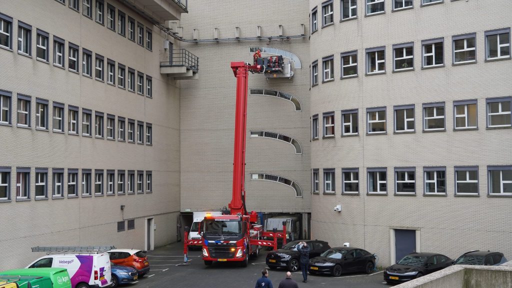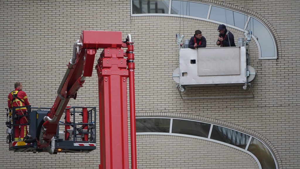 Bij het KPN-gebouw aan het Stationsplein zaten maandagochtend twee glazenwassers vast in hun glazenwassers bakje. De brandweer moest hen bevrijden uit hun benarde situatie.