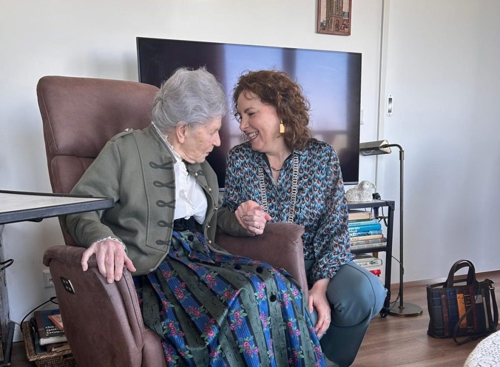 Mirjam van ’t Veld, gedecoreerd met ambtsketen, kwam op bezoek om mevrouw Vos te feliciteren. Ook nam Van ’t Veld een passend cadeautje mee.