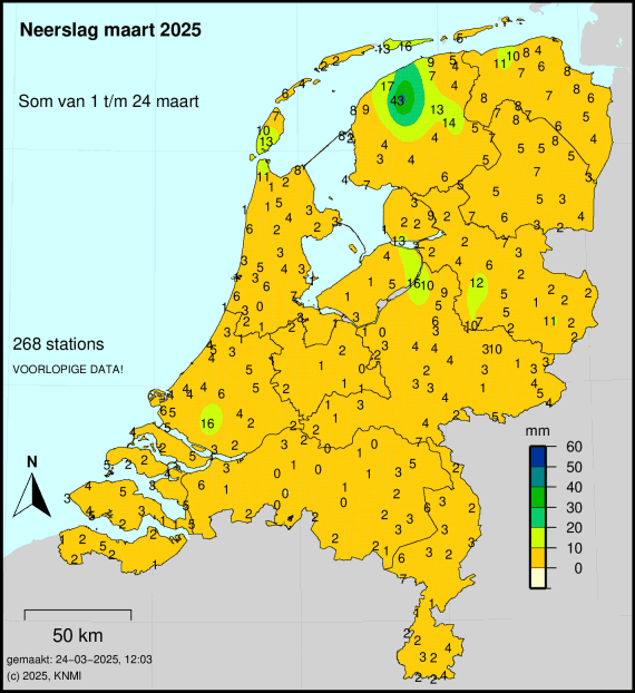 Tot en met maandag viel er op Groningen Airport Eelde (het officiële KNMI-meetstation voor onze omgeving) slechts 6,4 mm neerslag. Normaal valt er in maart ongeveer 65 mm regen. Daarmee staat deze maand in de tussenstand op de eerste plaats sinds het begin van de metingen in 1901. De droogste maand maart was in 1996, toen er 7,1 mm regen viel. Ook maart 2012 en 2022 waren erg droog, met respectievelijk 10,6 en 11,9 mm in 31 dagen.