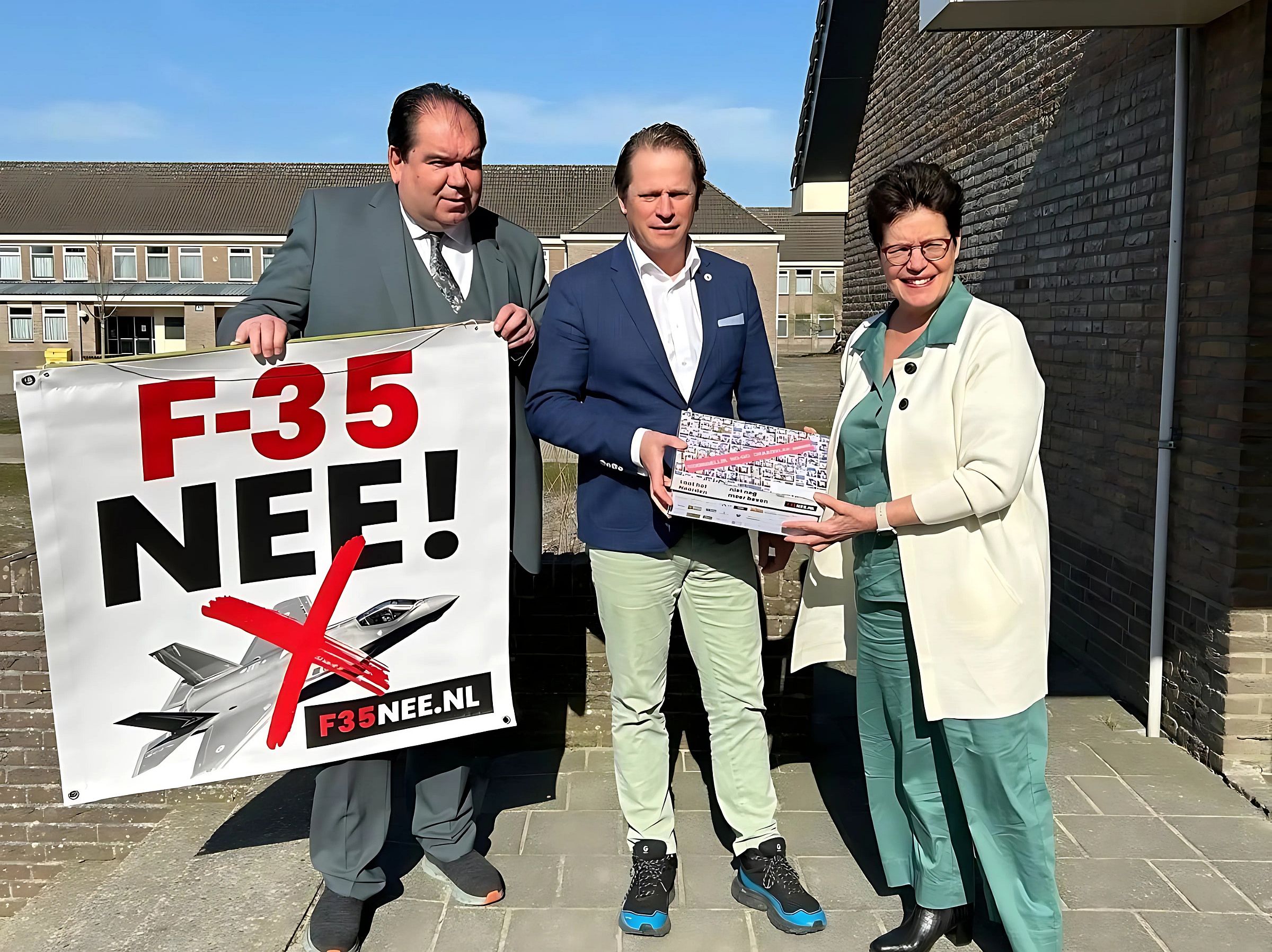 Burgemeester Marcel Thijsen van de gemeente Tynaarlo, Staatssecretaris van Defensie Gijs Tuinman en Yvonne Turenhout Gedeputeerde provincie Drenthe. - Foto via 'F-35 Nee'