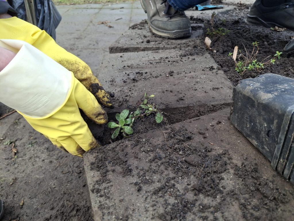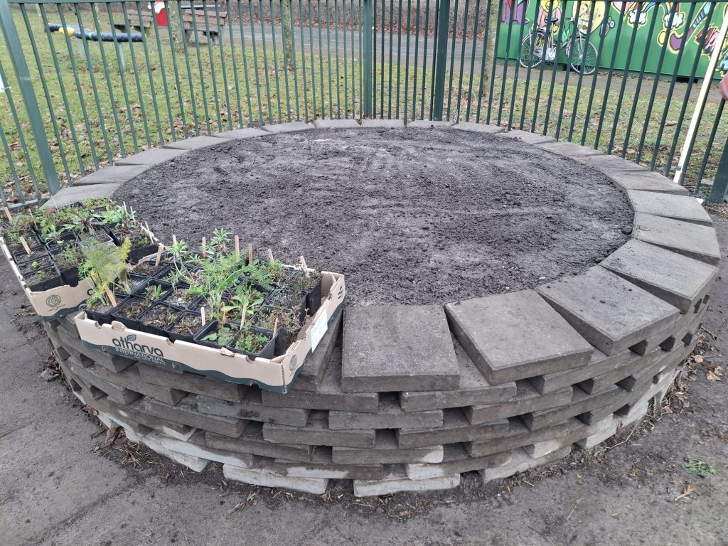 “Dat is vooral hard werken. Met stoeptegels, die eerder uit tuinen gewipt zijn, hebben we een cirkel gebouwd van ongeveer veertig centimeter hoog. Deze bouw je op en metsel je tot een stevig fundament. Vervolgens is het een kwestie om met kruiwagens aarde in de cirkel te storten. Donderdag hebben we de cirkel gebouwd en gevuld, en vrijdag hebben we de planten geplant.”