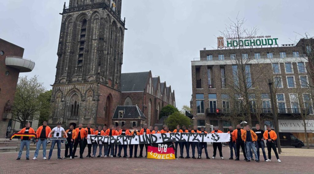 De hooligans hadden hun bomberjacks binnenstebuiten gekeerd om de oranje kleur te laten zien. Ze poseerden vervolgens achter een lang spandoek met daarop de tekst ‘erobert und besetzt’ (‘veroverd en bezet’), samen met een Duitse vlag.