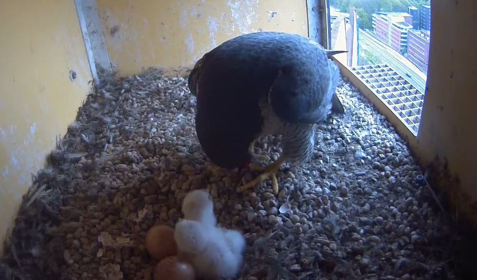 Kort voor het middaguur was het gekrijs te horen van het eerste jong. Moeder slechtvalk trok er vrijwel gelijk op uit om het jong een maaltje te bezorgen. Na nog drie uur broeden kwam ook het tweede slechtvalkkuiken uit zijn ei. Opnieuw ging moeder op pad om eten te halen. Vervolgens klom de moedervogel terug op haar nest om ook de laatste eieren uit te broeden.
