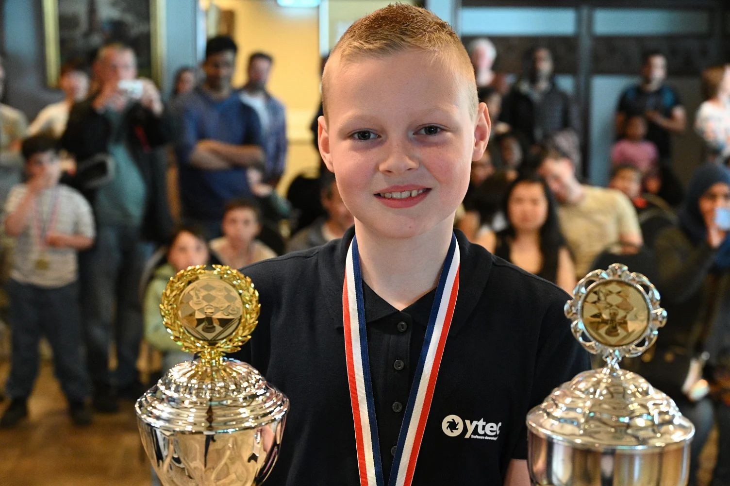 Bram ten Dam (9) uit Ten Boer werd afgelopen zaterdag voor het tweede jaar op rij Nederlands Kampioen schaken bij de jeugd van tien jaar en jonger.