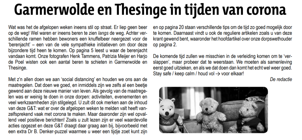 “Voor de Garmer & Thesinger begon het in 1975. De dorpskrant werd in dat jaar gestart door Geerth Boschma en Roelof Ganzeveld met als doel om de leefbaarheid in Garmerwolde en Thesinge te vergroten. Het lijkt erop dat dit in de afgelopen vijftig jaar zeker gelukt is. De krant heeft bijgedragen aan de interactie. Om in christelijke termen te spreken: Garmerwolde is wat vrijzinniger dan Thesinge. Het zijn dorpen met allebei hun eigen identiteit. Maar door de jaren heen zijn we samen evenementen op gaan pakken. De Zummerspeulen bijvoorbeeld, maar ook de intocht van Sinterklaas. Als dorpskrant doen we verslag van deze activiteiten waarbij we inwoners informeren en samen proberen te brengen.”