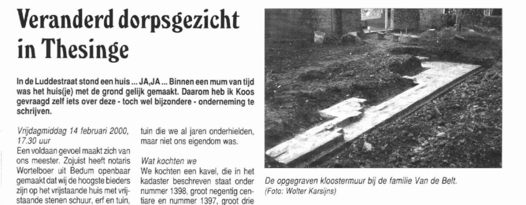 “Dat is eigenlijk een heel persoonlijk verhaal van toen ik nog geen lid was van de redactie. Toen we in Thesinge kwamen wonen, betrokken we een woning op een respectievelijk kleine kavel. In 2000 overleed onze achterbuurvrouw. Op dat moment onderhielden we al haar tuin. Uiteindelijk hebben we dit huis met de tuin gekocht. Toen we het huis sloopten, kwamen we restanten tegen van het oude klooster dat in Thesinge had gestaan. Er is toen ook onderzoek gedaan door de archeologische dienst. Daar heb ik een heel mooi artikel over kunnen schrijven. Heel persoonlijk, maar ook omdat het hele interessante informatie naar voren heeft gebracht. Ja, daar ben ik trots op.”