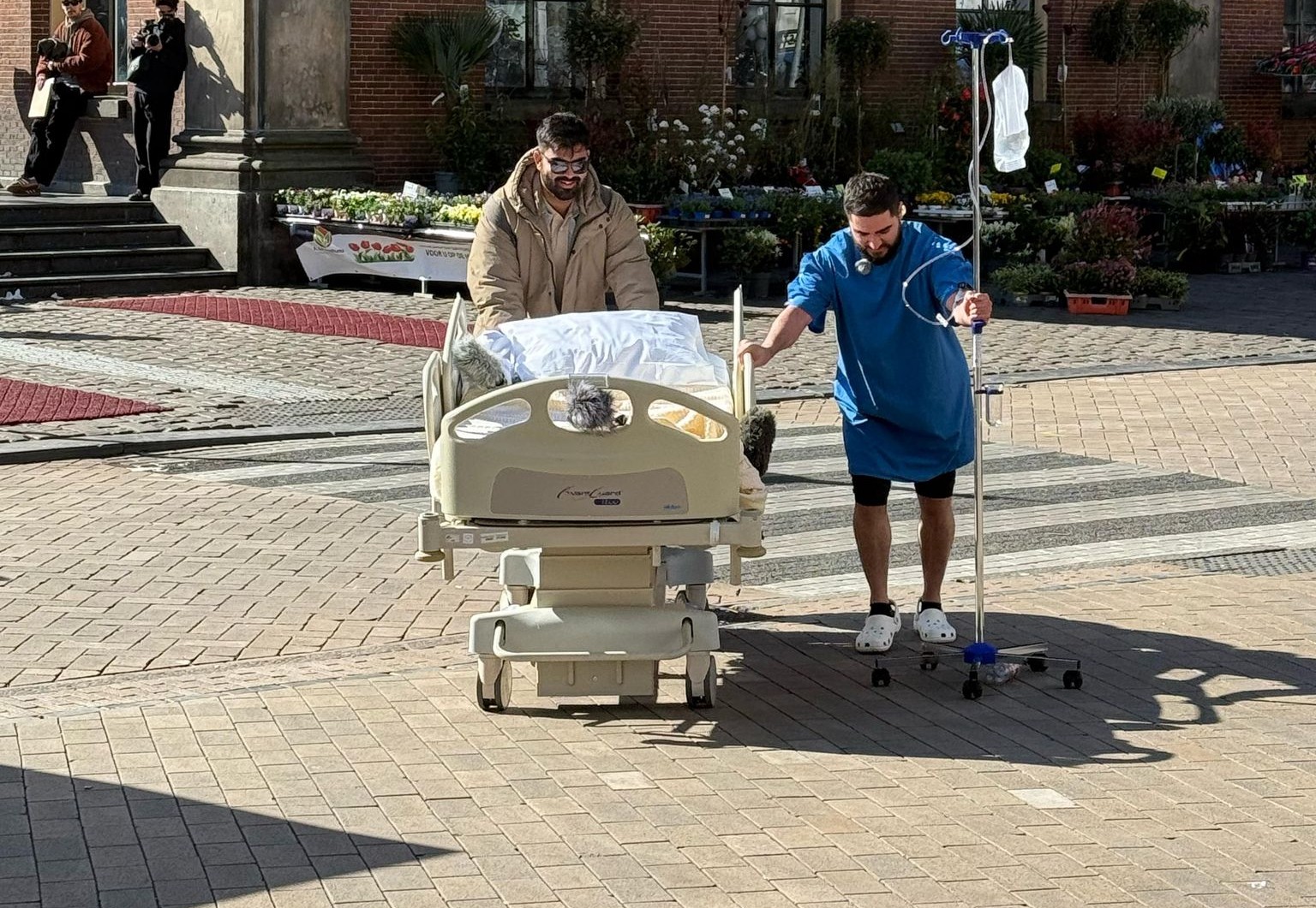 “Reden van deze actie is dat we met het publiek in gesprek willen over de zorg”, vertelt Gerlinde Kamping van Gezond Groningen. “Het gaat namelijk niet goed en met deze actie wilden we de urgentie benadrukken. Dat hebben we gedaan door voor een verrassende manier te gaan. Een patiënt in een ziekenhuisbed liep door de binnenstad en vroeg voorbijgangers om hulp.”