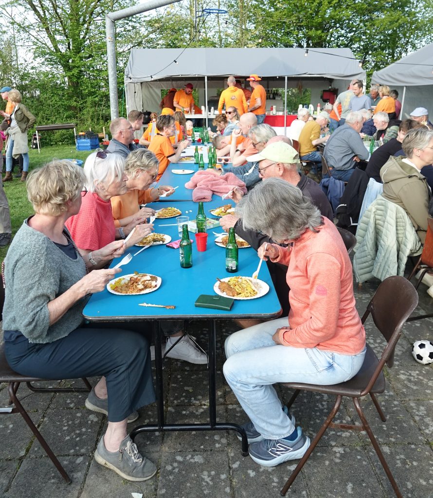 “We hadden bedacht om het gezamenlijk af te sluiten met een Indische rijsttafel. Er was bami, rijst, saté, zilveruitjes. Uiteindelijk schoven meer dan honderd mensen aan. Dat was ontzettend gezellig. We denken dat we hiermee ook iets heel moois neerzetten. Mensen verblijven de hele dag op het sportveld. Ze hoeven tussentijds niet naar huis om nog voor eten te zorgen. En dat je uiteindelijk aan lange tafels gezamenlijk zit te eten: dat is echt een feestje. Eten verbindt.”
