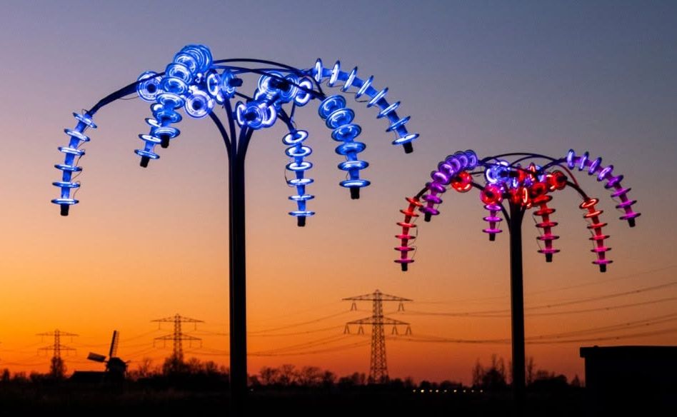 Langs het hoogspanningsstation in Vierverlaten staat sinds kort een aantal opvallende kunstwerken. De kleurrijke ‘Levensbomen’ zijn gemaakt van oude glazen isolatoren uit hoogspanningsmasten.