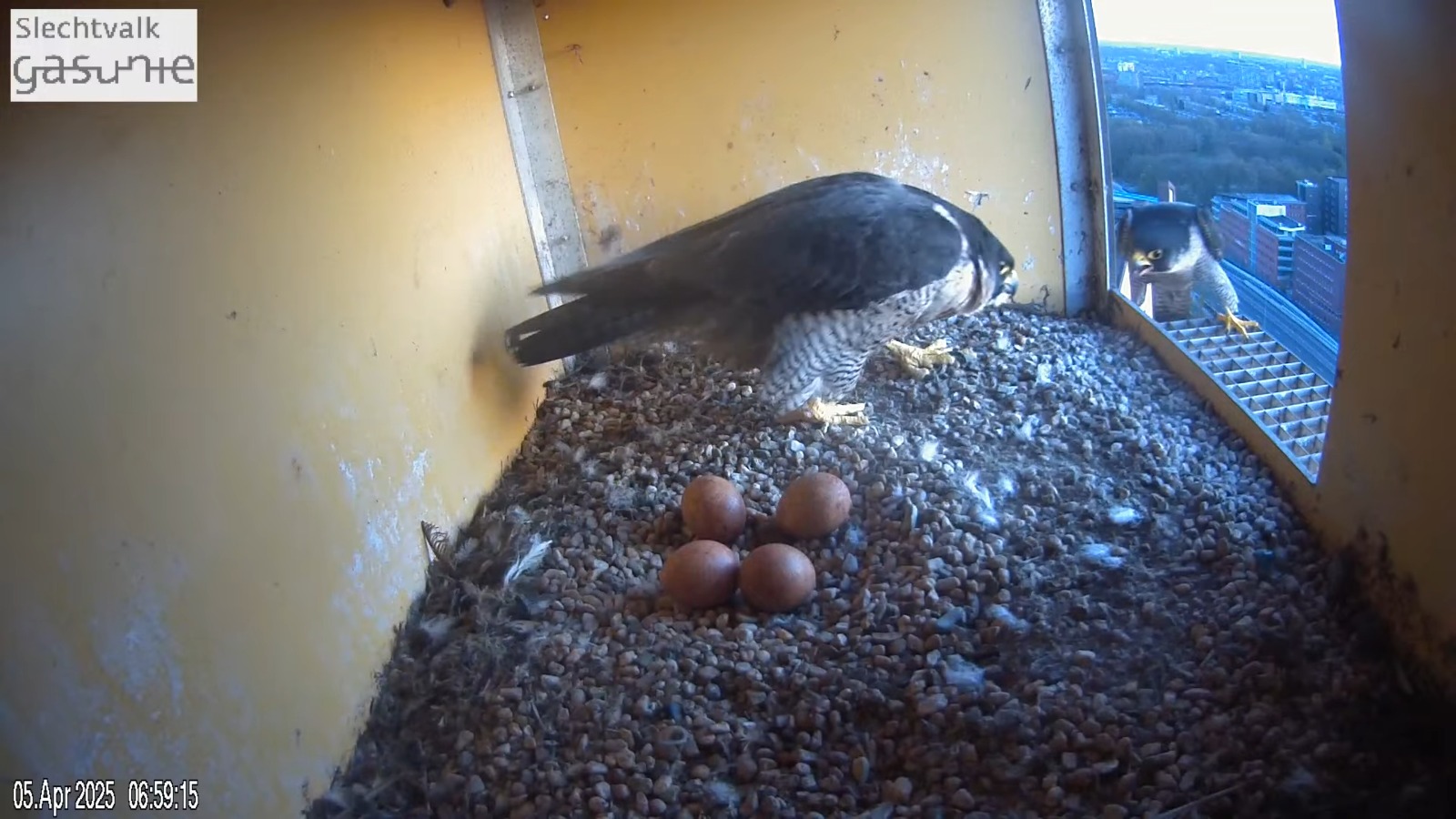 De slechtvalken in de nestkast bij het Gasunie-gebouw hebben afgelopen dagen een vierde ei gelegd. Volgens Michiel Bal van de Gasunie is het daarmee een bovengemiddeld jaar.