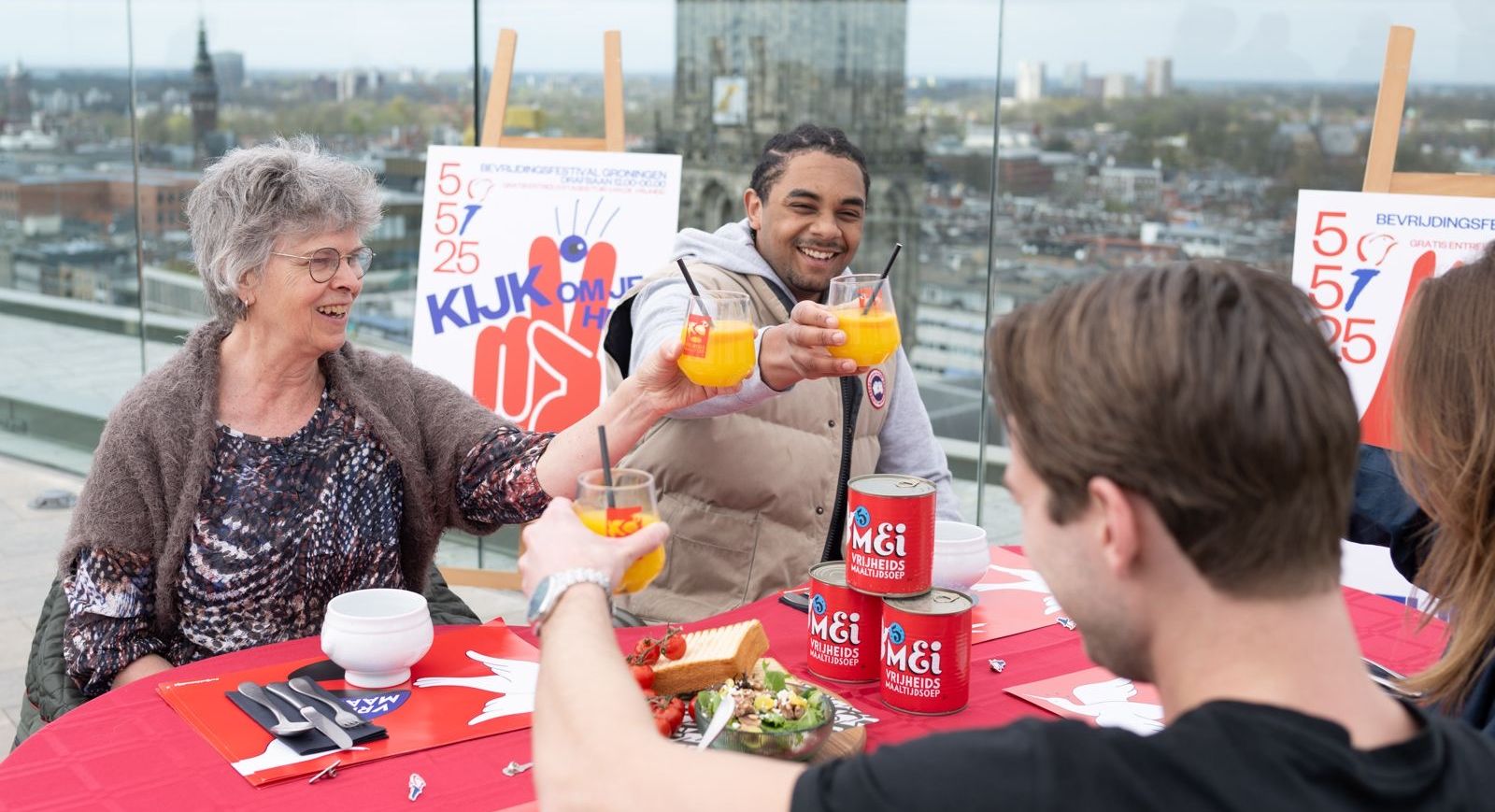 De Vrijheidsmaaltijd op 5 mei vindt dit jaar plaats op het dak van Forum Groningen. Honderden mensen schuiven aan voor een gezamenlijke lunch, met uitzicht over de stad.