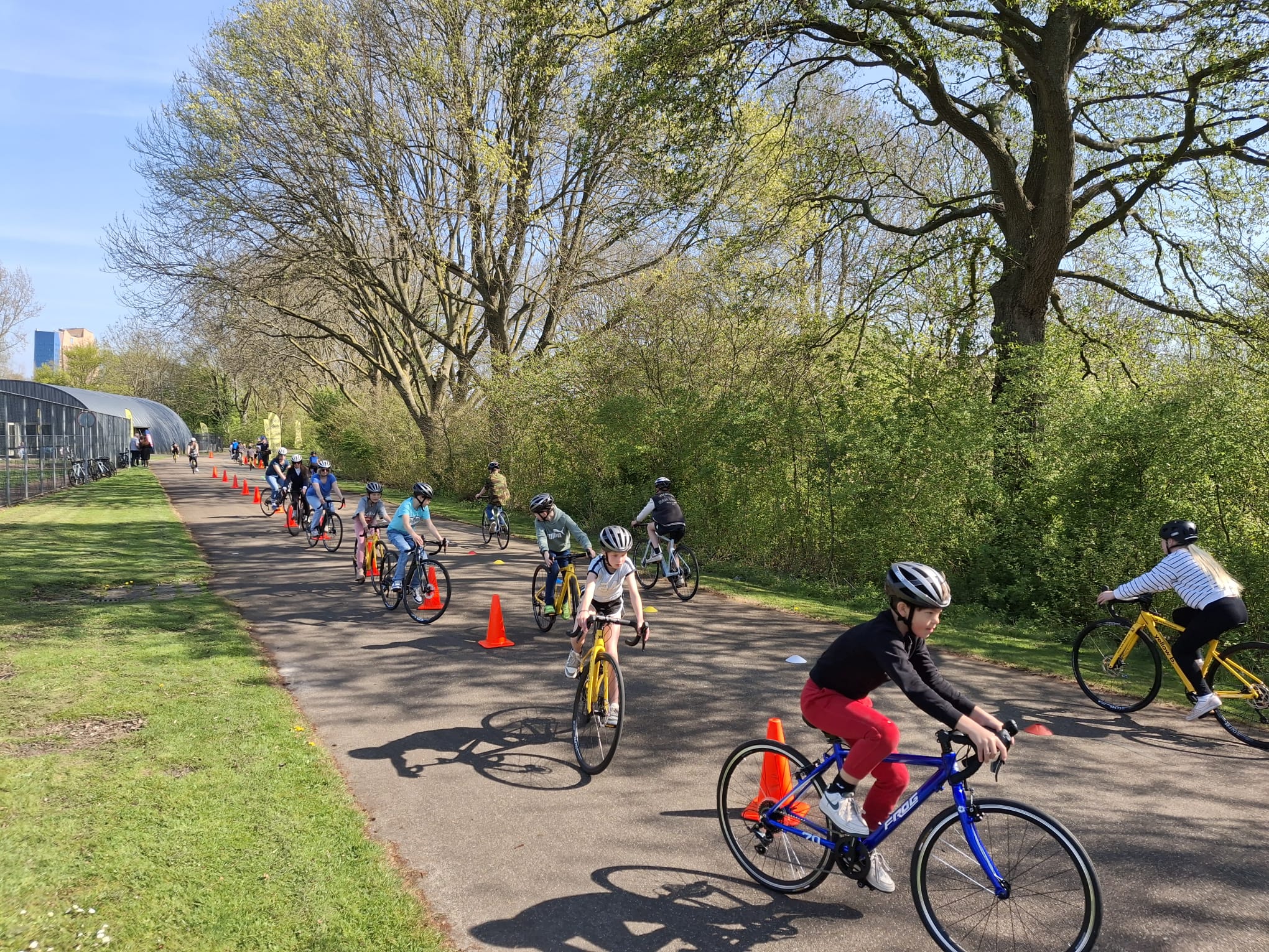 Ook werden er verschillende wielertechnieken aangeleerd, zoals slalommen, bidons aannemen en wegzetten en remmen, met als afsluiter een heel rondje fietsen op de wielrenbaan.