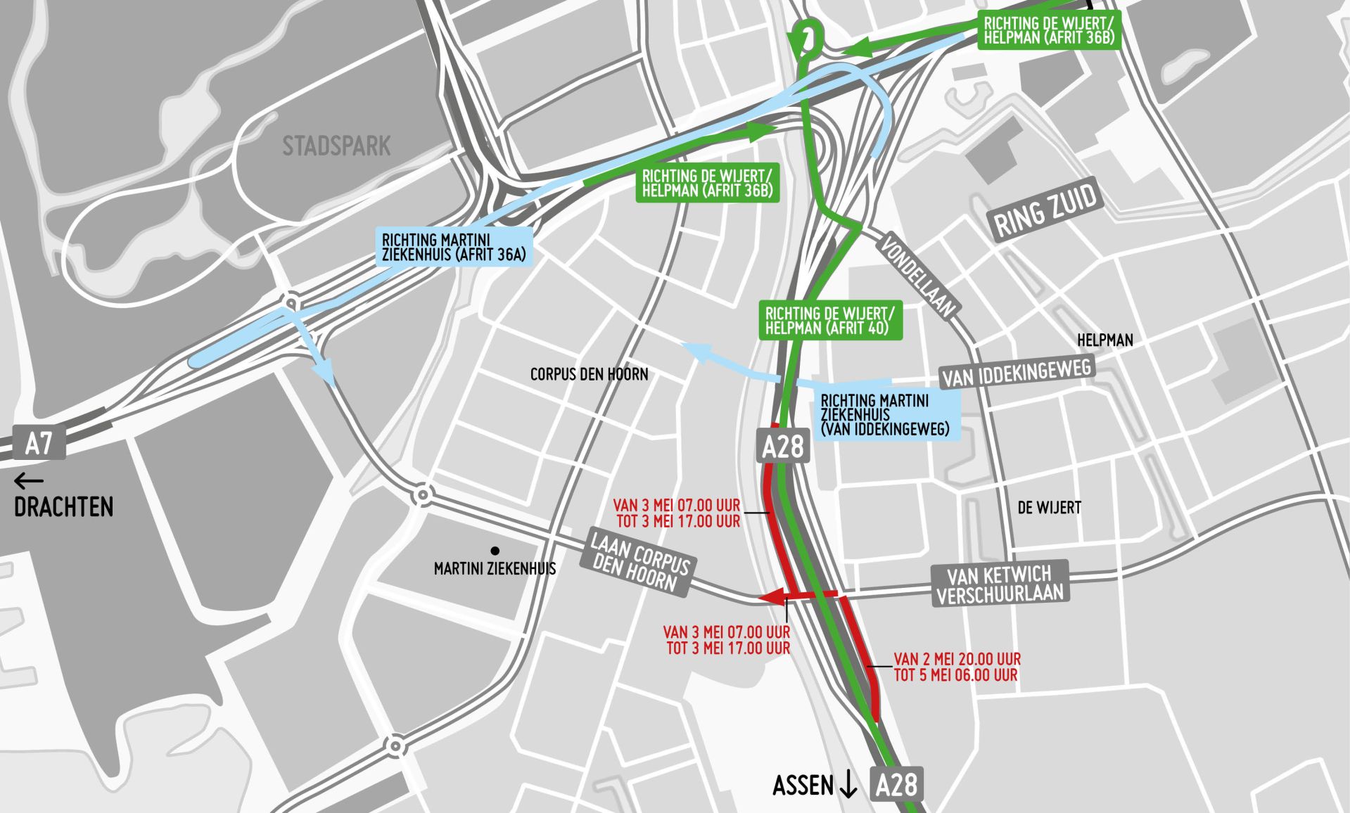 Vanaf vrijdagavond 20.00 uur tot maandagochtend 06.00 uur is afrit 39 Groningen-Zuid afgesloten voor verkeer vanuit Assen. Zaterdag overdag — tussen 07.00 en 17.00 uur — kan ook verkeer vanaf het Julianaplein de afrit niet gebruiken. Tegelijkertijd is de Van Ketwich Verschuurlaan onder de A28 in westelijke richting dicht.