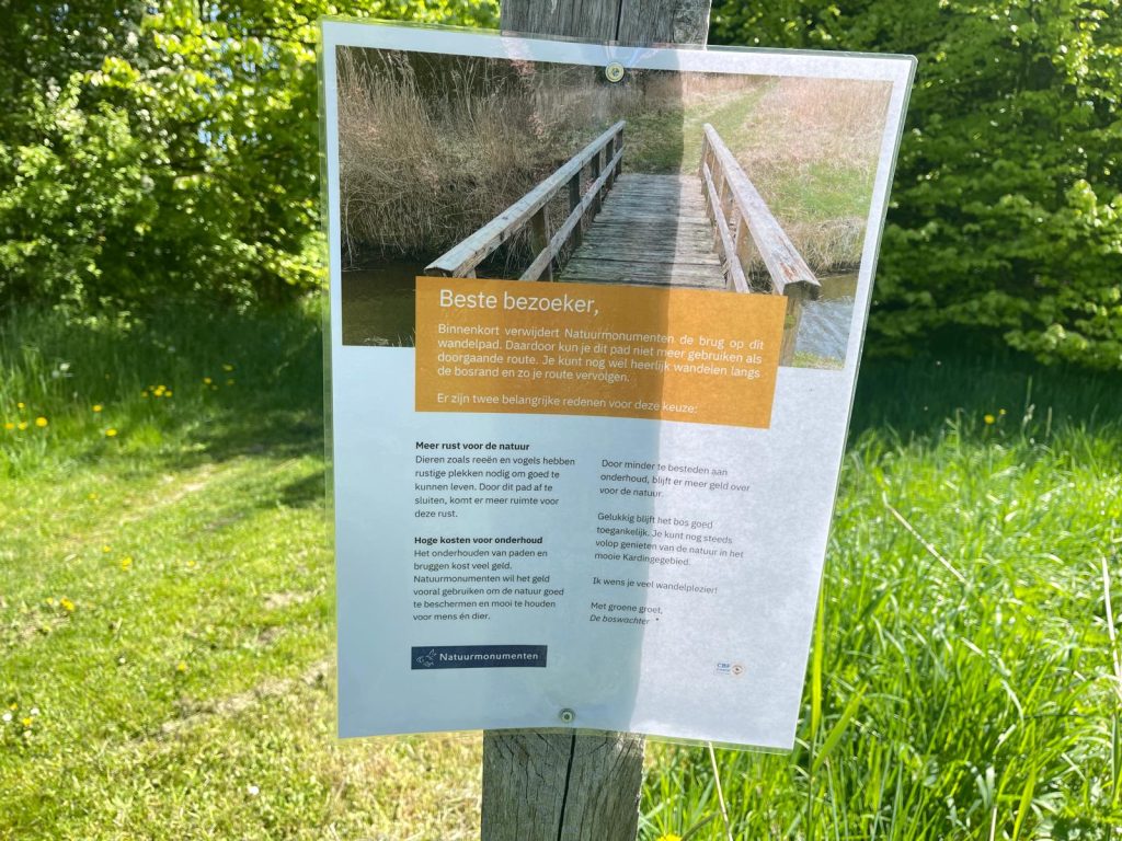 Hartog: “Het is ook de kunst om soms als het ware met een helikopter boven het gebied te gaan hangen en je af te vragen wat er nodig is. Het vervangen van een brug kost namelijk flink wat geld. Als je dit niet uitgeeft, kun je het investeren in de natuur, wat wij als Natuurmonumenten ook erg belangrijk vinden. Toevallig bevond deze verbinding zich ook bij het zogeheten rustgebied. Er bevinden zich veel vogels en reeën die in deze periode reekalfjes hebben. Door het weghalen van de brug beperk je de bewegingen waardoor er voor de dieren meer rust ontstaat.”
