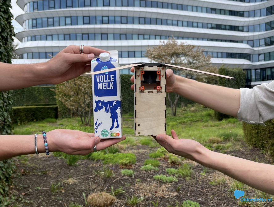 “De satelliet heeft de grootte van een melkpak,” aldus Van Burg. “Deze satelliet wordt vanaf 400 meter hoogte met een drone losgelaten. Tijdens de val klappen vleugels uit om de snelheid te verminderen. In deze satelliet zitten een ei, water en zaadjes, die de val en impact allemaal moeten overleven.”